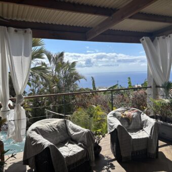 Ce logement bénéficie d’une très belle vue sur l’océan, que l’on peut apprécier depuis une agréable varangue attenante au séjour. L’appartement se compose, à l’étage, d’un beau séjour avec cuisine équipée ouverte, et d’une première chambre. En rez-de-jardin, vous trouverez une seconde chambre avec un accès direct à un petit jardinet, ainsi qu’une salle de bain avec douche et un WC. Deux places de parking sont également comprises avec la location.