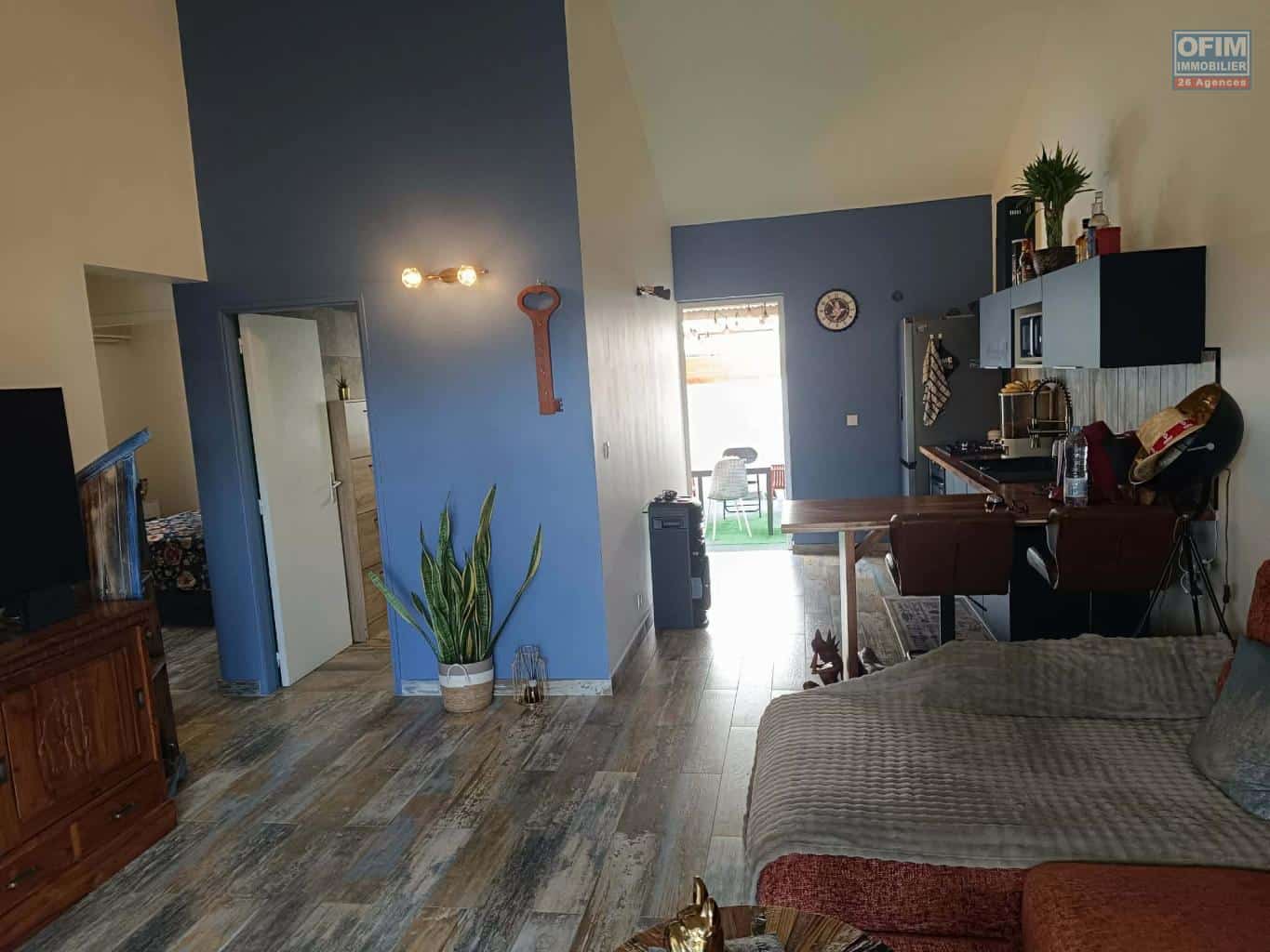 Accessible aux personnes à mobilité réduite, la villa dispose à l’avant d’une agréable varangue, d’une pièce de vie lumineuse comprenant salon, séjour et cuisine équipée neuve, de deux chambres dont une climatisée, ainsi que d’une salle d’eau moderne avec douche à l’italienne et WC.
